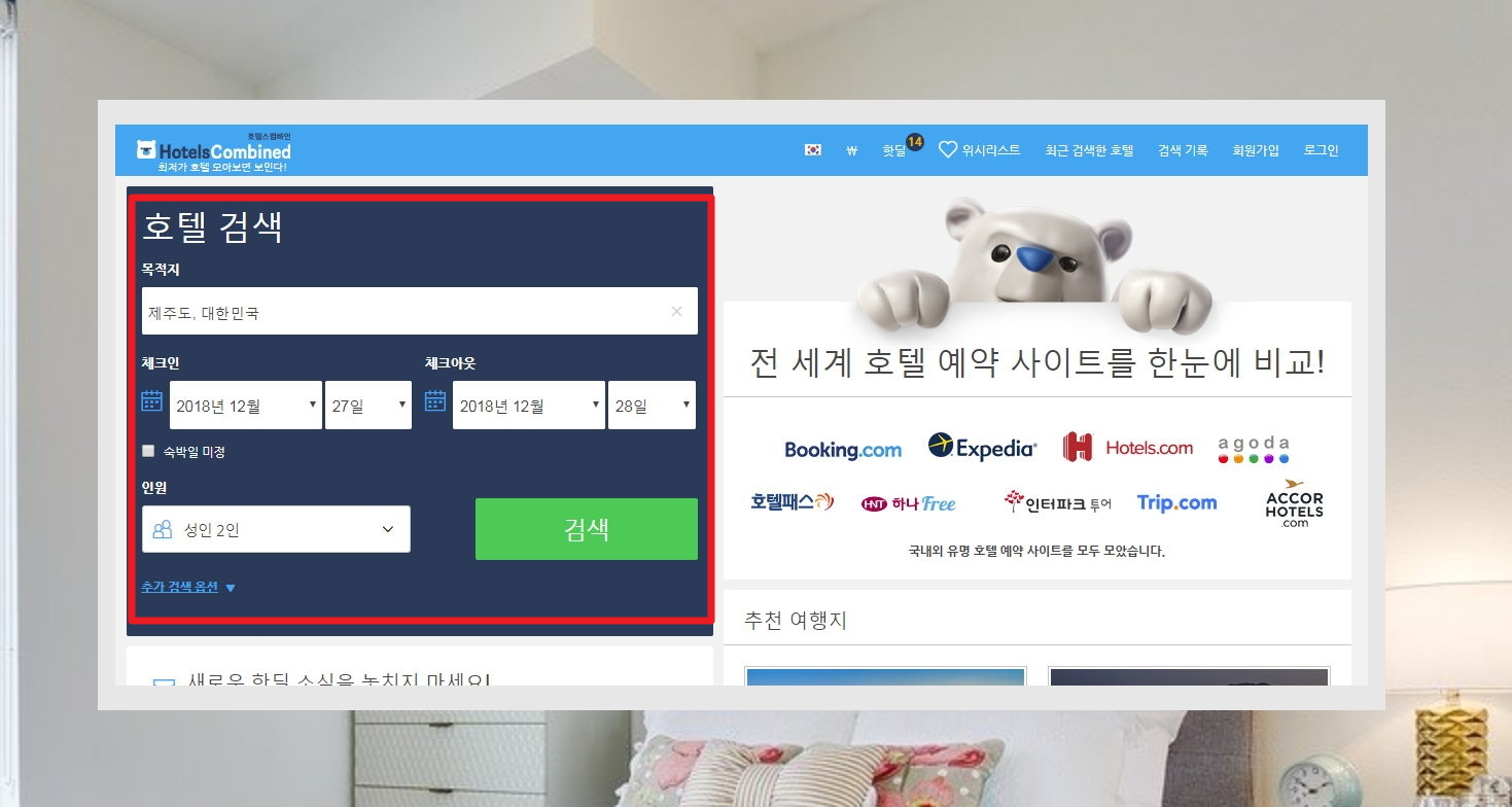 1. 티비나 유튜브를 통해 호텔 관련 사이트에 대한 광고를 많이 보셨을 겁니다. 여러 가지가 있기 때문에 어떤 것을 사용해야 할지 모르실 수 있는데요. 각자 장단점이 있기 때문에 직접 사용해보고 결정하는 것이 좋습니다. 그럴 시간이 없으시다면 호텔스컴바인을 이용해보세요. 그러한 사이트들의 정보를 이곳에서 검색할 수 있거든요. 자세한 것은 사용법과 함께 알려드리겠습니다.