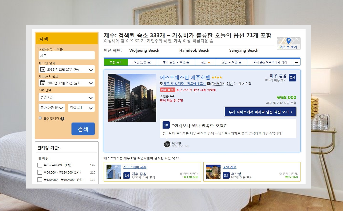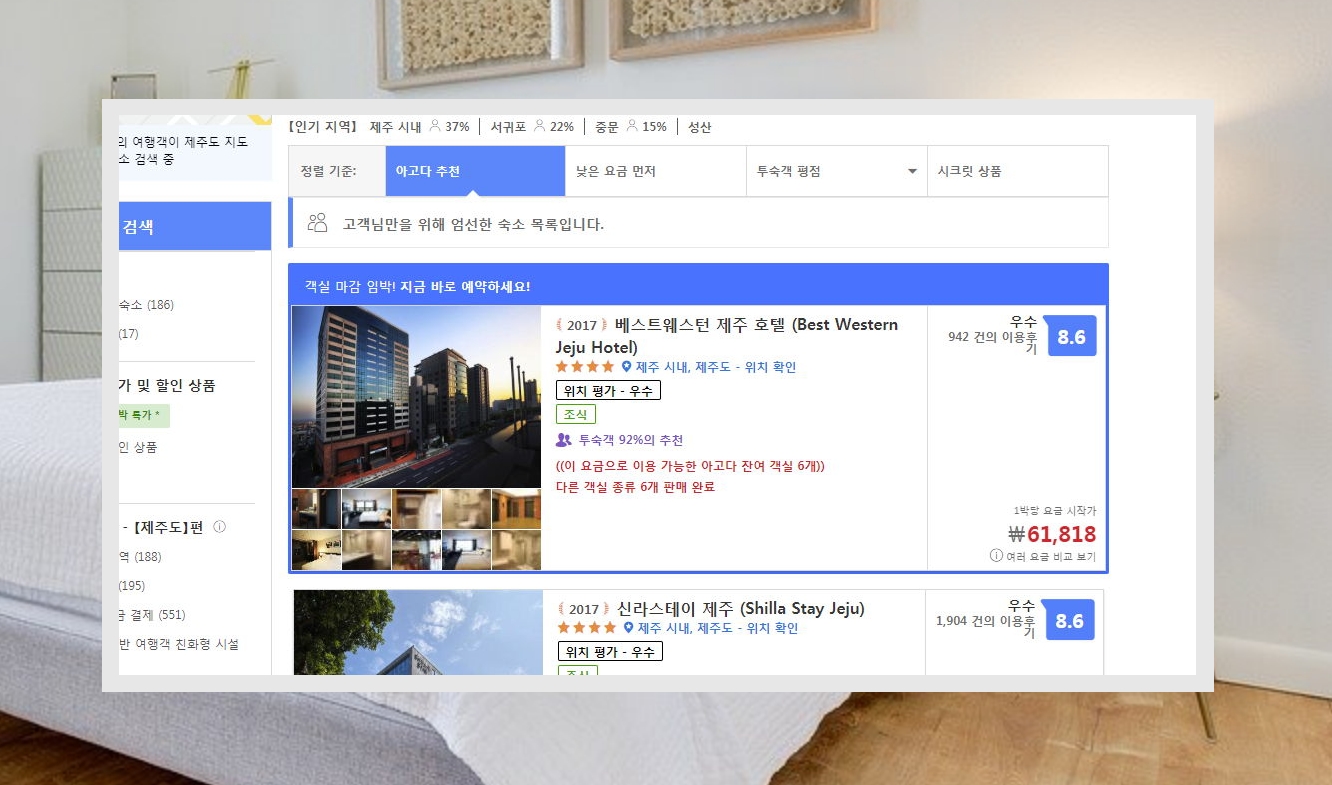 5. 저는 비싼보다는 5만원에서 10만원 사이의 국내숙소를 선호합니다. 이에 맞게 상세 검색 설정을 하고, 사이트에서 추천하는 숙소로 정렬을 해보았습니다. 제주에서 유명한 베스트웨스턴 호텔이 나타나네요. 금액도 저렴한 편이고요. 가격 아래에 보면 "웹사이트 비교하기" 버튼이 있습니다. 클릭해 보세요.