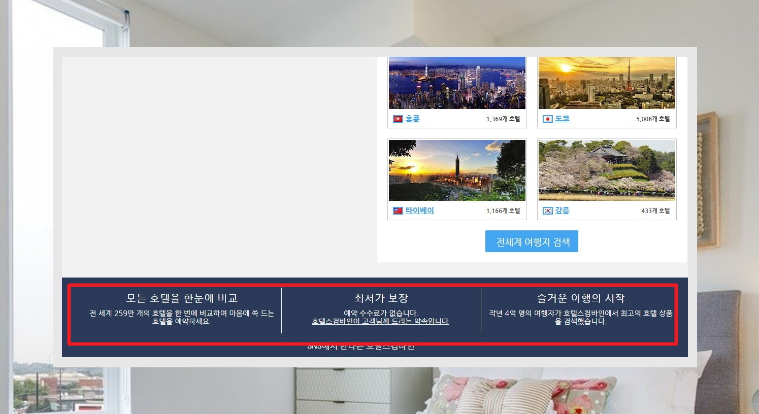 2. 호텔스컴바인에서는 259만 개에 달하는 해외 및 국내숙소의 정보를 보유하고 있습니다. 그렇기 때문에 여행을 가는 지역에 있는 숙소를 이곳에서 쉽게 찾으실 수 있는데요. 금액도 함께 나오겠죠? 최저가 보장 정책을 펼치고 있기 때문에 저렴한 금액으로 예약도 가능합니다.