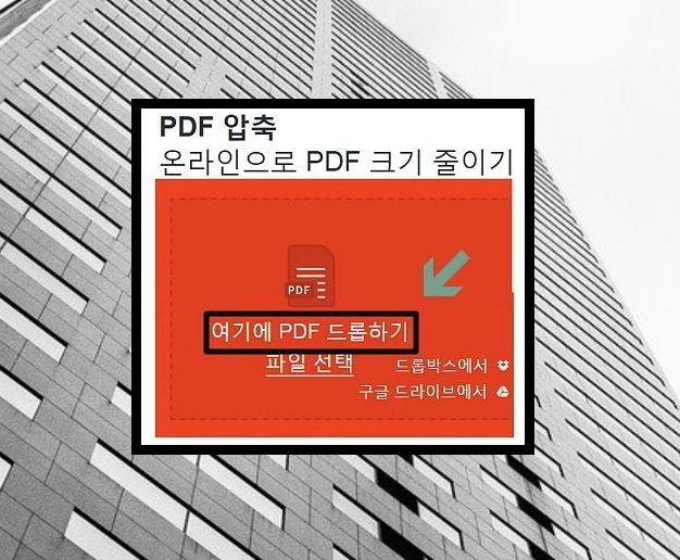 4. "PDF 압축" 버튼을 통해 들어가시면 위와 같은 화면이 나오는데요. pdf 용량 줄이기 대상파일을 선택해주세요. 인터넷 저장매체(드롭박스, 구글 드라이브)에 있는 pdf 파일도 압축하실 수 있답니다. 해당 사이트를 이용한 pdf 파일은 보안 정책에 따라 1시간 안에 서버에서 영구히 삭제되고, 아무도 볼 수 없도록 100% 안전을 보장한다고 합니다.^^