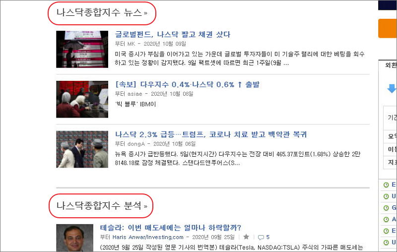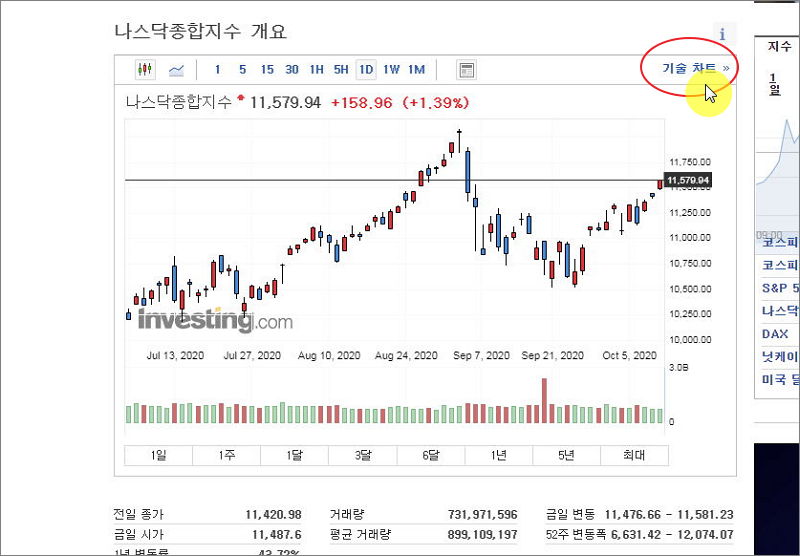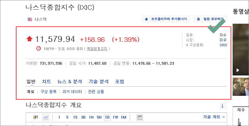 지수 리스트에서 미국의 나스닥 종합지수를 클릭해 보았어요.