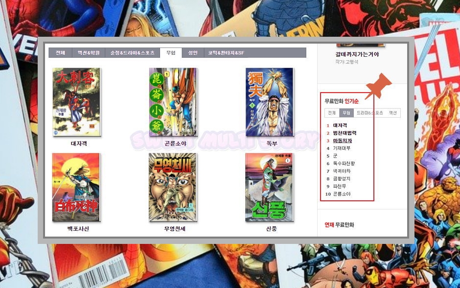 저는 가끔씩 찜질방에 가면 만화를 즐겨봅니다. 너무 재미있어서 시간이 훌쩍 가버리는데요. 특유의 그림체가 정겹고, 스토리가 흥미롭게 전개되기 때문에 마지막 권을 볼 때까지 눈을 땔 수가 없는데요. 이제는 인터넷 무료 사이트를 통해 무협만화 전권을 볼 수 있습니다. 방법은 정말 간단해요.