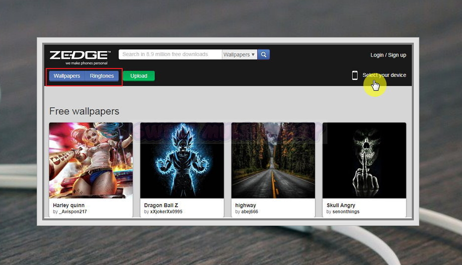 ZEDGE에서는 배경화면 파일도 이곳에서 받아볼 수 있는데요. 왼쪽 위에 있는 ringtones를 클릭하면 벨소리 다운받기 하실 수 있고, Wallpapers를 클릭하면 배경화면 자료를 찾아보는 것도 가능합니다. 일단 이전에 할일이 있는데요. 'select your device'를 클릭하여 본인의 휴대폰 기종을 설정해주서야 합니다. 아이폰이라면 꼭 해주셔야 해요.