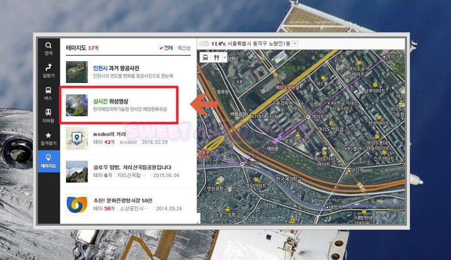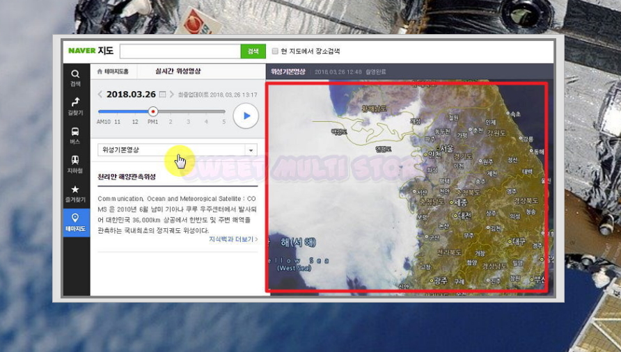 ▲ 한국해양과학기술원 천리안 해양관측위성이 관측하는 실시간 위성지도를 볼 수 있습니다. 국내 최초의 정지궤도 위성이죠.