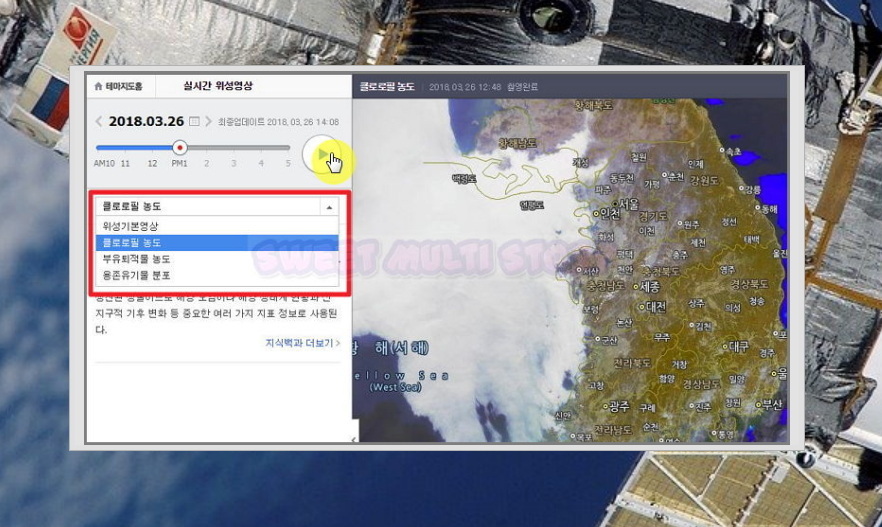 ▲ 선택 버튼을 클릭하면 위성지도에서 클로로필 농도, 용존유기물 분포, 부유퇴적물 농도를 볼 수 있습니다. 재생 버튼을 클릭하면 실시간으로 움직이는 영상을 볼 수 있어요.