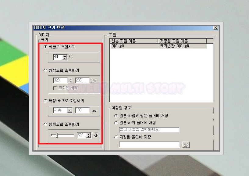 비율, 해상도, 특정 축 기준, 용량 이렇게 4가지 기준을 설정한 후 확인 버튼을 누르면 됩니다.
