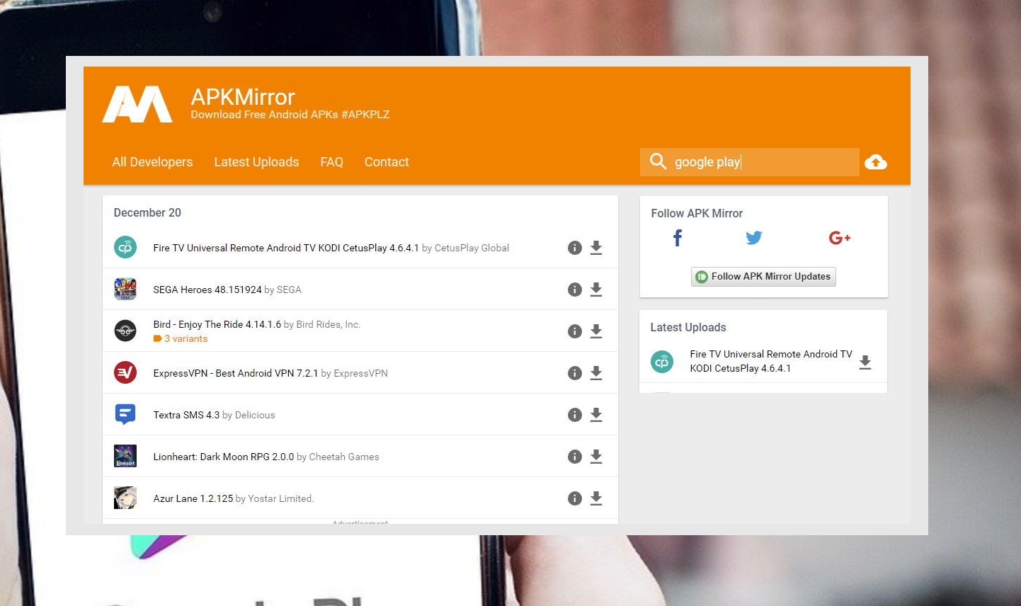 1. 스마트폰 어플을 다운로드 받거나 설치하려면 플레이스토어가 필요하죠? 그런데 지금 스토어 앱이제대로 작동하지 않으니 어떤 앱도 쉽게 찾아보거나 설치할 수 없는 상황입니다. 걱정하지 마세요. APK 파일을 이용하면 스마트폰 전용 어플을 수동으로 깔아보겠습니다. apkmirror 사이트에서 apk 파일을 내려 받을 수 있어요.