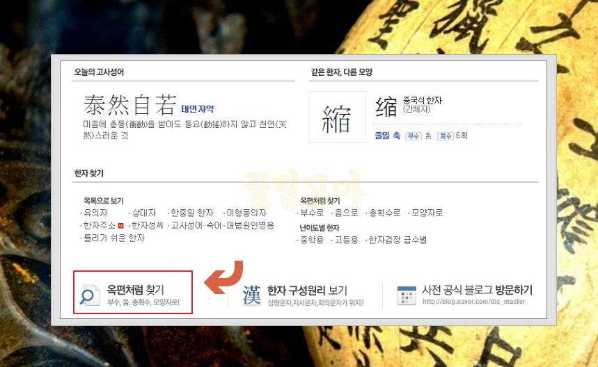 사전을 가지고 직접 한문을 찾는 것이 익숙한 분들은 '옥편처럼 찾기' 서비스를 이용해보세요.