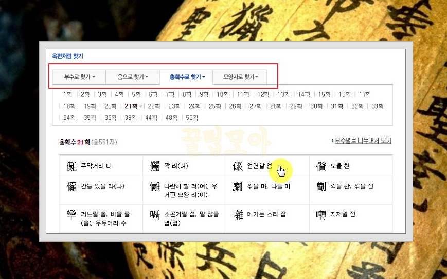 보시는 바와 같이 음, 부수, 총획수, 모양자로 찾을 수 있습니다. 총획수를 알고 있는 한자라면 해당 횟수를 카테고리에서 선택한 후 인터넷 옥편에 나온 한문을 찾아보시면 돼요.