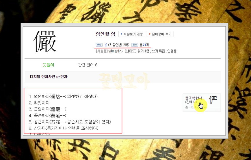 '엄연할 엄'자를 찾았는데요. 필기 입력으로 찾을 때와 동일한 수준으로 상세한 결과르 얻을 수 있습니다.