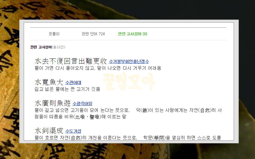 과거에 옥편 한문찾기를 하다보면 헤매는 경우가 있는데요. 그럼 1분 이상 걸리곤 했답니다. 지금은 인터넷으로 몇 초만에 결과를 볼 수 있고, 획수나 부수, 인명용 여부 등의 정보까지 얻을 수 있어요. 해당 문자가 들어간 단어와 고사성어를 통해 쓰임새도 알 수 있습니다.
