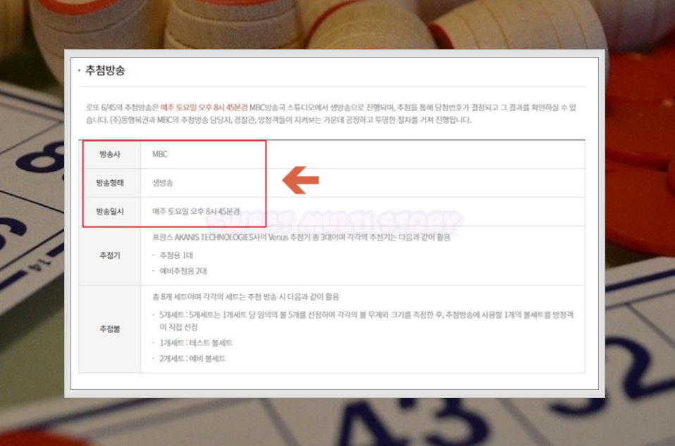 ▼ 가장 먼저 로또 추첨시간을 알려드리겠습니다. 티비를 통해 방송으로 추첨 과정을 확인할 수 있습니다. 매주 토요일 오후 8시 45분경에 MBC 채널을 틀면 나옵니다. 추첨하는 시간이 길지 않기 때문에 금방 확인할 수 있습니다. 해당 시간 이후에는 인터넷으로 확인이 가능합니다. 주관사인 동행복권 사이트에 접속하면 됩니다.