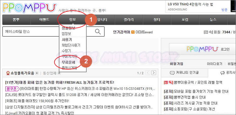 3. 뽐뿌에 접속했습니다. 굉장히 많은 정보가 눈에 띕니다. 특히 특가 상품을 구입할 때 유용한데요. 이러한 정보는 다음에 보시고, 일단 2024년 토정비결을 이용해 보도록 하죠. 메뉴에서 3번째 위치한 정보를 클릭해 보세요. 그럼 아래에서 2번째에 무료 운세 버튼이 있습니다. 클릭해 주세요.