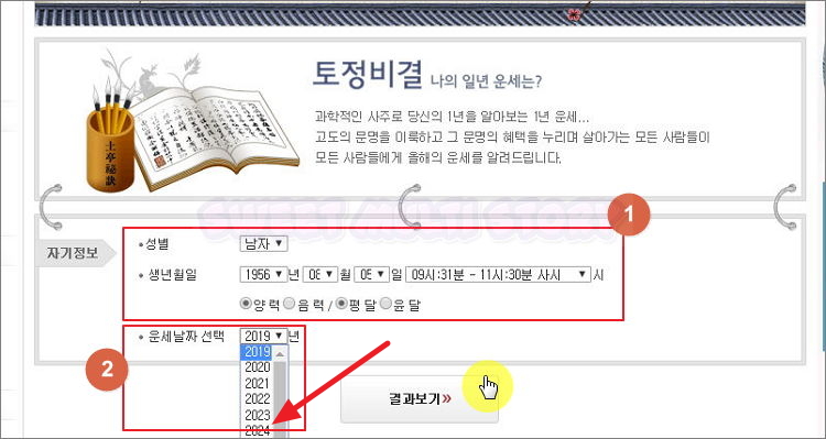 1. 지금 인터넷에서 토정비결을 볼 수 있는 사이트가 꽤 많습니다. 유명한 곳도 있고, 그렇지 않은 곳도 있는데요. 이번에는 사람들이 잘 모르는 사이트를 통해 무료 운세를 보는 방법을 알려드리려고 해요. 다른 곳과 다를 바 없이 2024년 운세는 물론이고, 2024년 이후인 먼 미래의 일까지 예측하는 데에 도움이 됩니다.