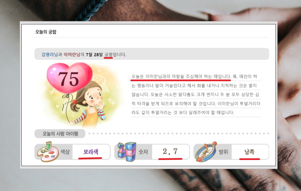6. 생년월일로 살펴본 궁합 풀이가 나왔습니다. 간단하게 우리 관계를 볼 수 있는 점수, 상세한 풀이, 오늘의 사랑 아이템 이렇게 3가지 영역으로 구성되어 있는데요. 풀이를 보니 오늘은 상대방과의 관계에 있어서 조심해야 한다고 합니다. 이럴 때에는 상대보다 더 배려심과 인내심을 갖고 대처하는 것이 관계 유지에 도움이 되겠네요.