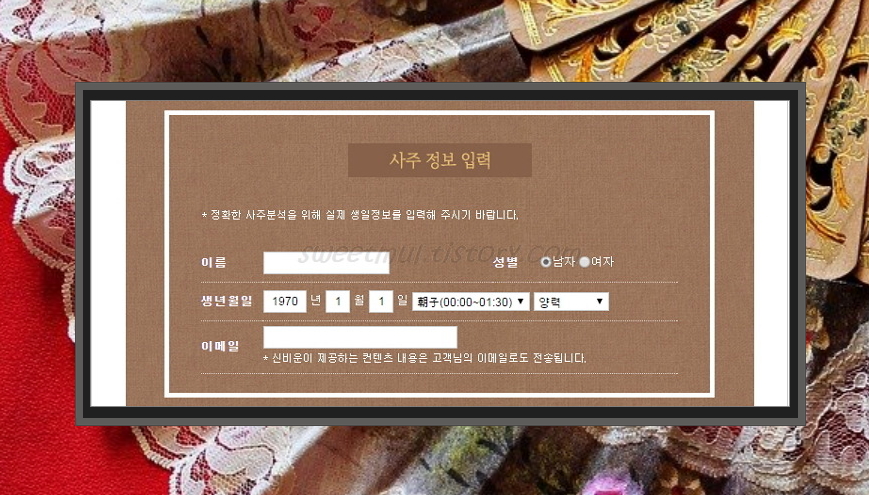 이지함 토정비결을 공짜로 보기위해서는 이름 / 성별 / 생년월일 / 태어난 시간 / 이메일주소를 입력하셔야 되는데요. 결과를 지금 당장 볼수 있지만, 메일로도 받을 수 있답니다.