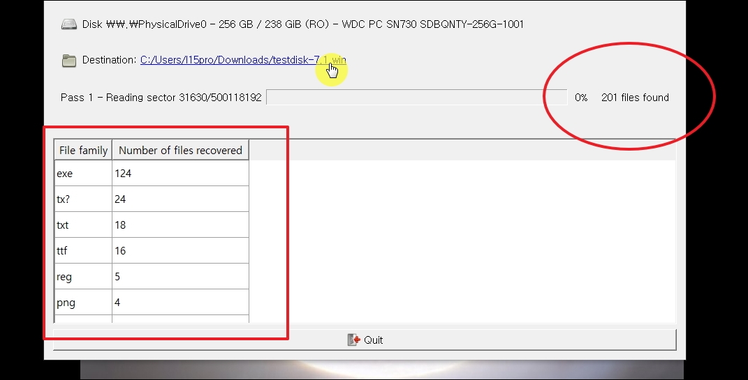 ▼컴퓨터에서 지운 파일을 복구하는 작업이 진행됩니다. 프로그램 화면에 표시된 퍼센트 게이지를 지켜 보면서 100%가 될 때까지 지켜봅니다. 100%가 되면 좀 전에 지정한 폴더를 열어봅니다.
