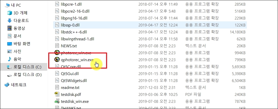 ▼CGSecurity에서 다운 받은 파일은 압축이 되어 있습니다. 압축 해제 프로그램인 알집이나 반디집을 이용하여 압축을 풉니다. 압축이 풀리면 qphotorec_win으로 되어 있는 파일을 클릭하여 실행합니다.