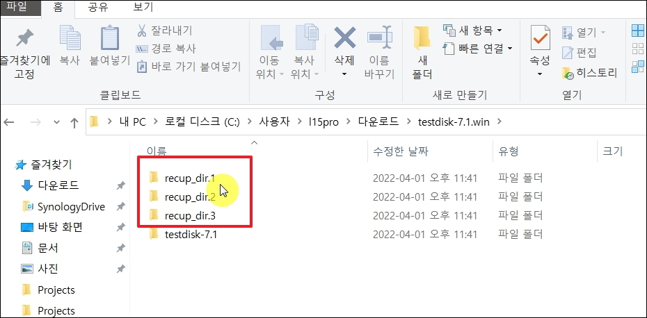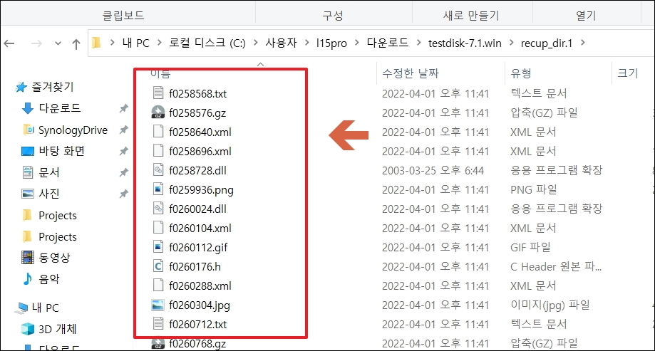 ▼폴더를 열어보면 recup_dir로 시작하는 폴더가 여러 개 생성되어 있는 것을 확인할 수 있습니다. 하나씩 폴더를 열어봅니다.