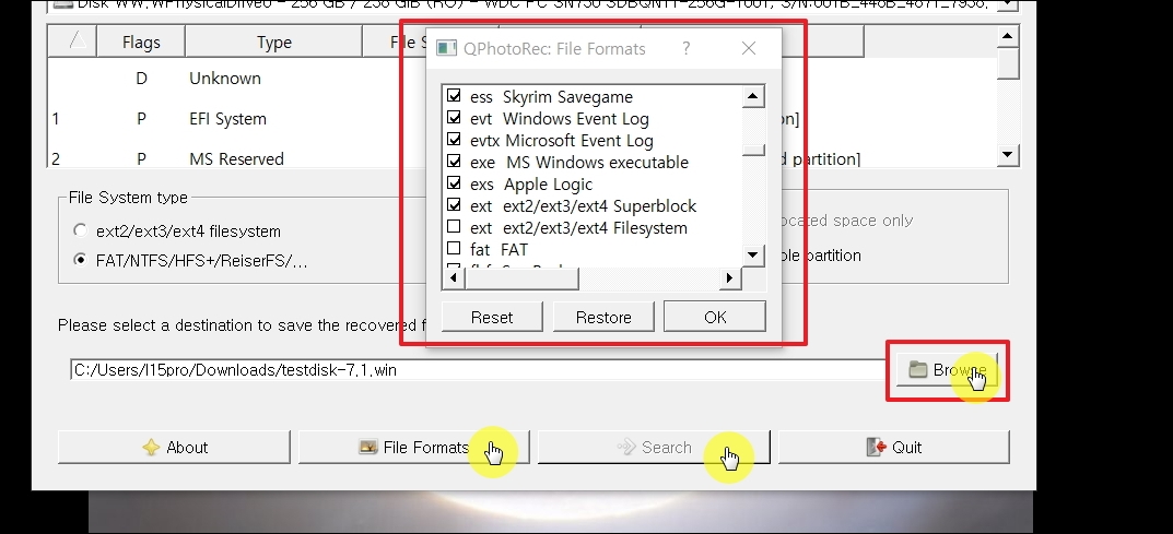 ▼다음 단계에서는 [Browse] 버튼을 눌러 휴지통에서 지운 파일을 되살렸을 때 저장할 폴더를 지정합니다. 그 다음 복구 대상이 되는 파일의 확장자를 선택합니다. [File Formats] 버튼을 클릭하면 확장자 선택이 가능합니다. 확장자 선택을 하지 않아도 무방하지만, 많은 파일 중에서 본인이 되살리려고 했던 것을 찾으려면 시간이 많이 걸릴 수 있기 때문에 확장자 선택 방식을 추천합니다. 여기까지 완료했으면 [Search] 버튼을 클릭합니다.