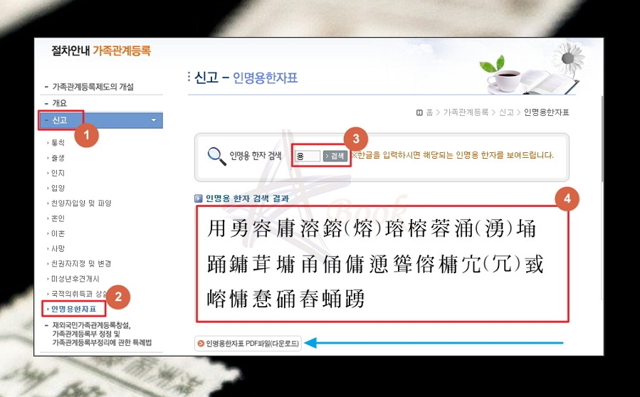(4) '신고 ▷ 인명용 한자표 ▷ 입력 및 검색' 클릭