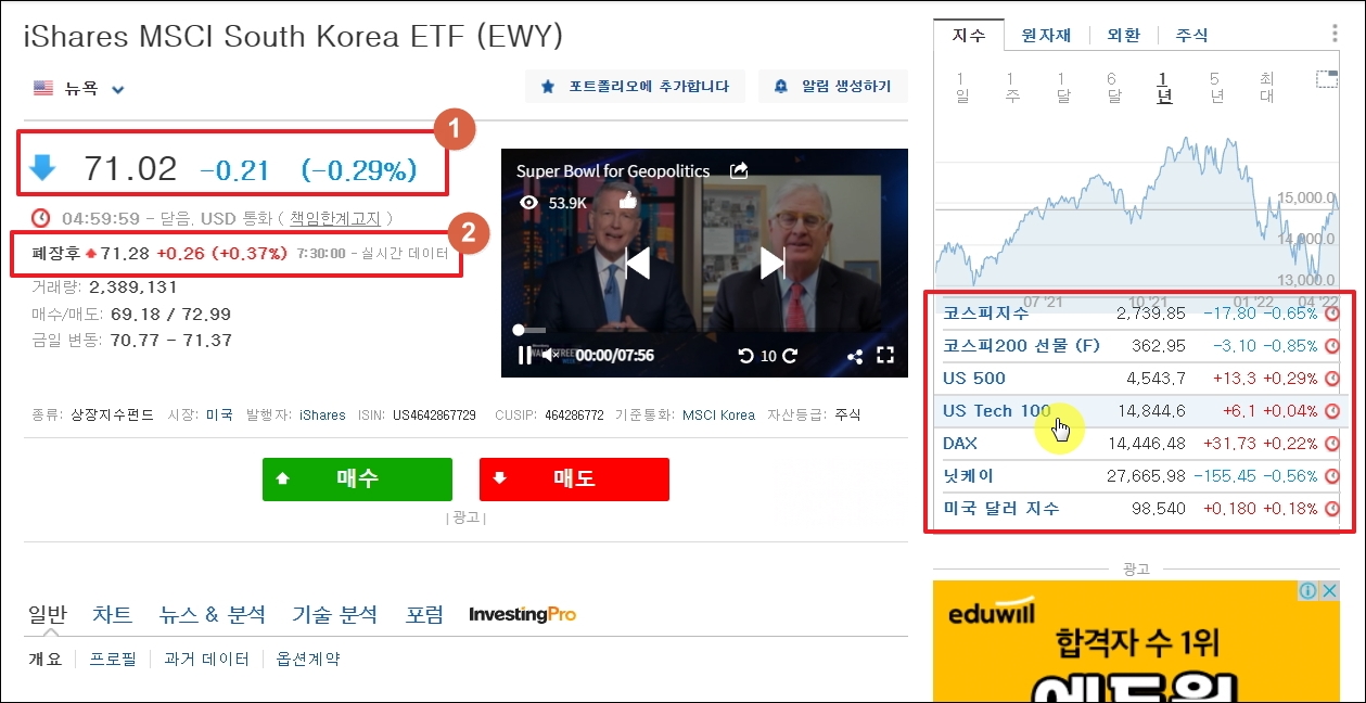 ▼두 번째로 내일 증시 전망에 도움이 되는 지표는 EWY 입니다. MSCI South Korea Cap ETF 입니다. 미국 시장에서는 해당 ETF를 통해 우리 주식시장에 투자를 합니다. EWY가 새벽 동안 어떤 흐름을 보였는지 확인해보면 내일 증시 전망을 파악하는 데에 큰 도움이 됩니다.