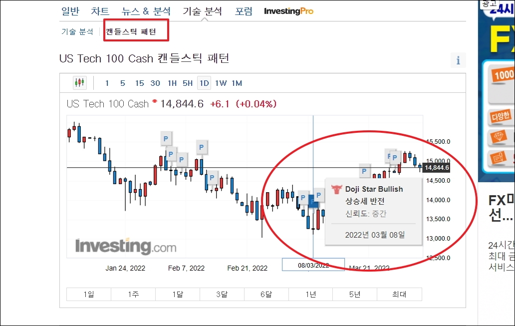 ▼메뉴에서 [캔들스틱 패턴]을 클릭하고, 그래프를 일봉으로 바꾸어 봅니다. 그럼 유의미한 캔들 패턴이 나왔을 때를 쉽게 파악할 수 있습니다. 무조건 맞는 것은 아니기 때문에 어느 정도 내일 증시 전망을 한 상태에서 근거를 찾아볼 때 사용하는 것이 좋습니다. 이러한 것이 맞으면 좋겠지만, 최근 들어 반대로 가는 경향이 있습니다. 이런 경향 속에서는 반대로 참고하는 것도 방법이 될 수 있겠죠.