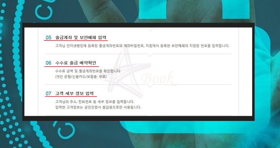 다음 단계에서는 인터넷 뱅킹에 등록된 출금계좌번호, 계좌비밀번호, 보안매체의 지정된 번호를 입력합니다. 수수료 금액이 무료인지 한 번 더 확인하고요. 자신의 주소와 전화번호 등의 정보를 입력하시면 됩니다.