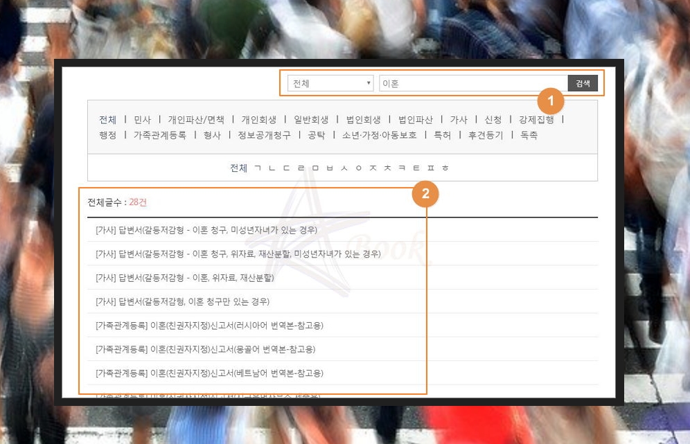법에 관련된 여러 양식이 나타나는데요. 이혼을 검색하면 28건의 관련 양식이 나타나요. 필요한 것을 골라서 사용하면 돼요.