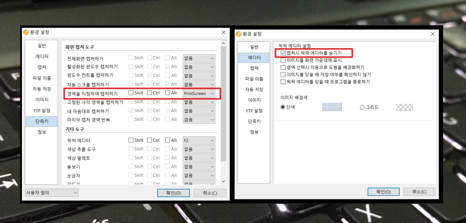 마지막으로 프린트스크린 버튼을 내 마음대로 변경하는 것이 가능합니다. 저는 영역을 지정하여 캡쳐하는 방식을 선호한다고 했습니다. 해당 방식을 이용하면 프린트스크린 기능을 사용할 때 화면 전체가 아닌 화면에서 원하는 부분만 잘라내서 이미지 파일로 만드는 것을 쉽게 할 수 있습니다.