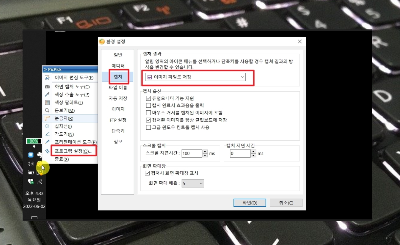 프로그램에 대한 기본 사용법을 알려드리겠습니다. 일단 프로그램을 실행한 상태에서 작업표시줄에 있는 픽픽 아이콘을 마우스 우클릭해 봅니다. 그럼 프로그램 설정 메뉴를 찾을 수 있습니다. 설정 창에서 [캡처] 메뉴를 선택하면 프린트스크린 버튼을 눌렀을 때 본인이 지정한 저장위치에 이미지 파일로 저장이 되도록 할 수 있습니다.