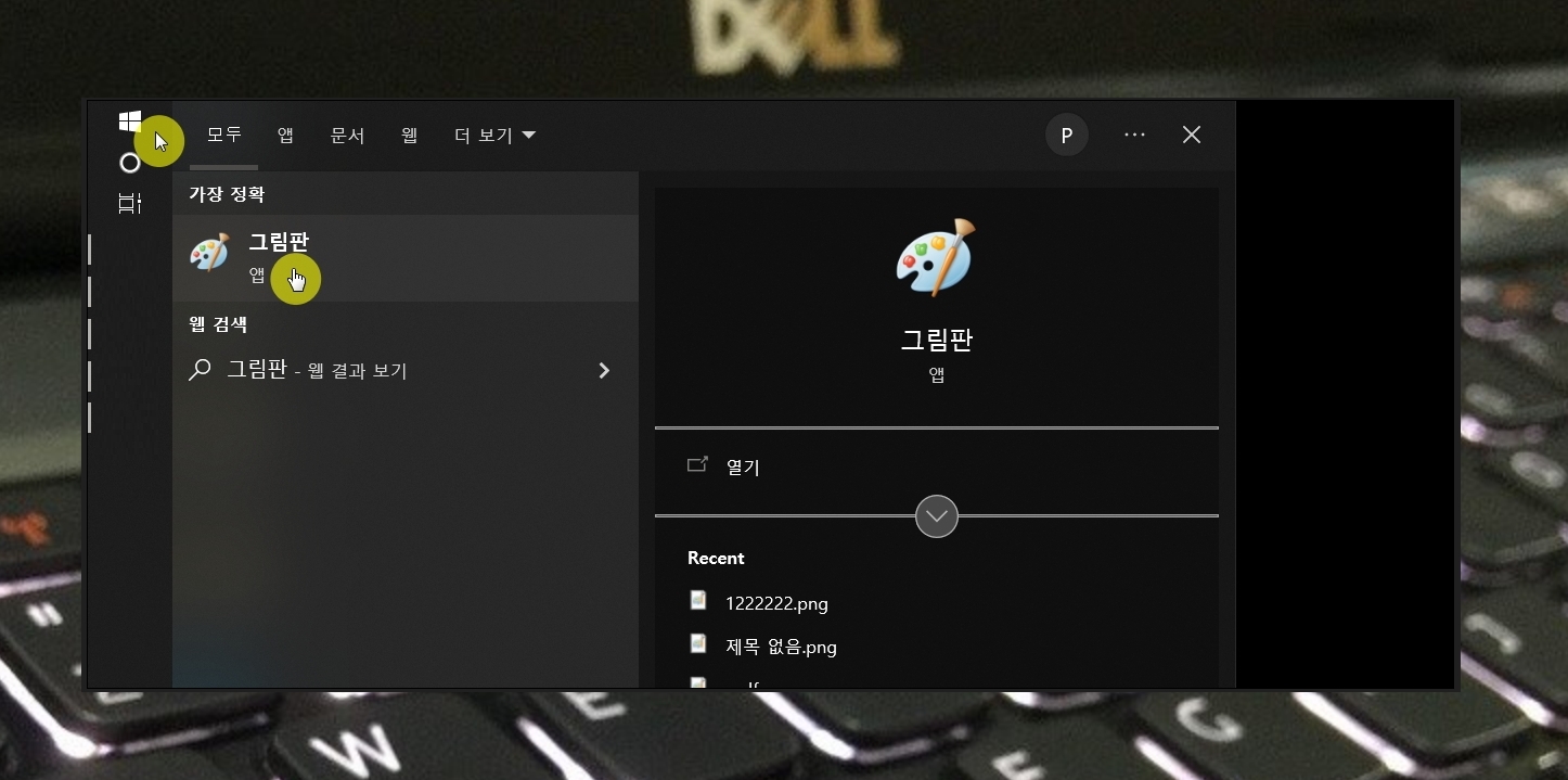 프린트스크린 버튼을 한 번 클릭한 상태에서 윈도우 시작 버튼을 클릭합니다. 그 다음 "그림판"을 입력하여 해당 프로그램을 실행합니다.