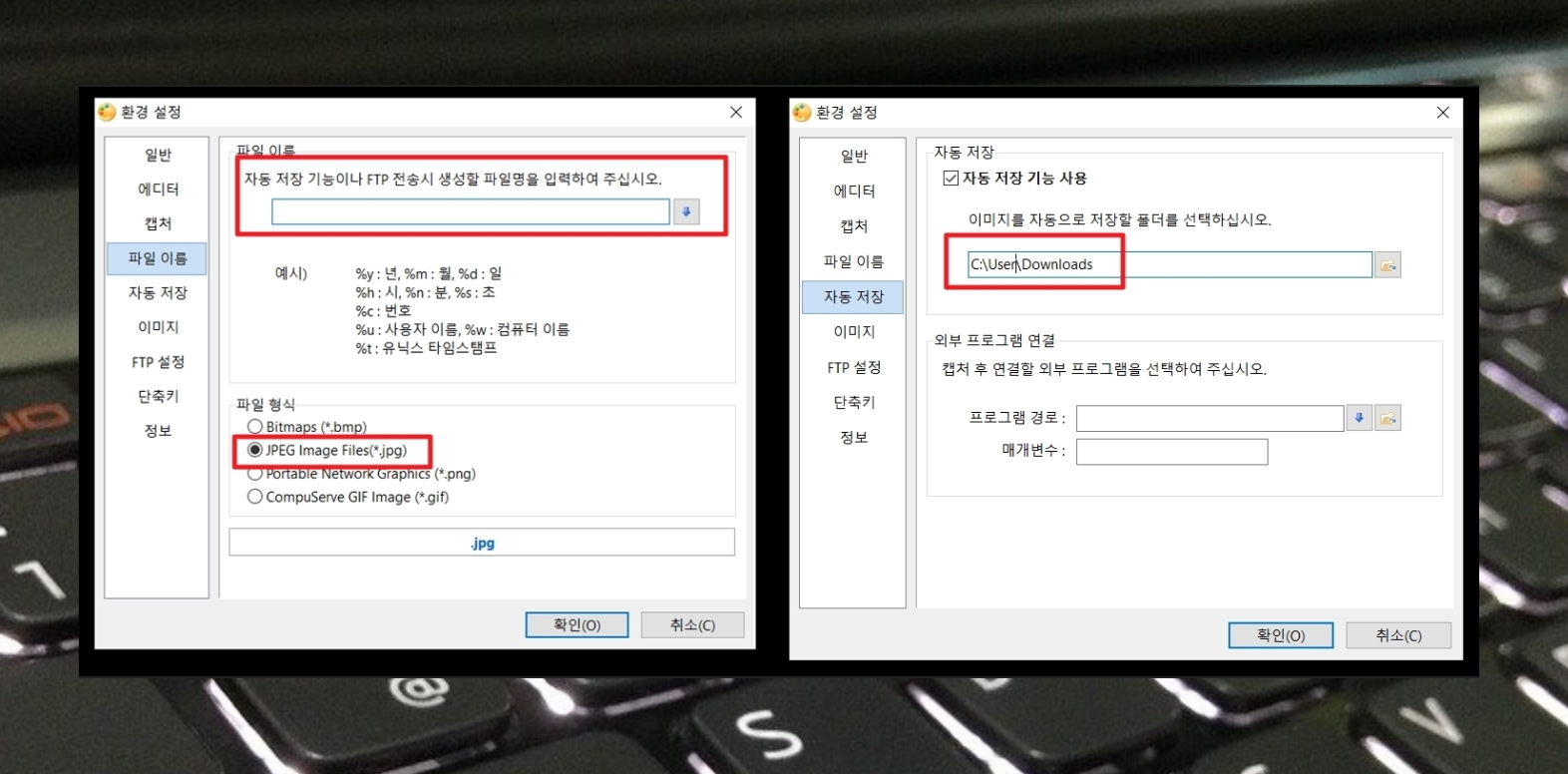 파일이름을 자동으로 생성되도록 하는 것도 가능합니다. 프린트스크린 버튼을 눌렀을 때의 날짜나 이름, 컴퓨터 이름, 순번 등을 이용하여 이미지 파일의 이름을 자동으로 생성해 줍니다. 일일이 파일 이름을 정할 필요가 없어서 편리합니다. 화면 캡쳐를 진행했을 때 생성되는 이미지 파일의 포맷도 자유자재로 정하는 것이 가능합니다. 많이 이용하는 JPG, BMP, PNG를 지정해 보세요.
