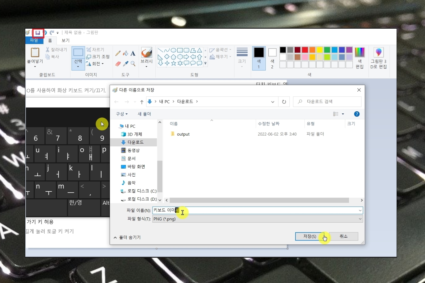 그림판이 열리면 빈 공간에 마우스 우클릭을 한 후 [붙여넣기]를 선택합니다. 그럼 그림판에 우리가 프린트스크린 버튼을 눌렀을 때 저장된 화면이 붙여집니다. 이 상태에서 원하는 모습으로 화면을 자르거나 수정을 합니다. 편집을 완료한 후 [저장] 버튼을 누르고, 본인이 원하는 저장위치에 파일 이름을 정하여 저장을 지정하면 됩니다.