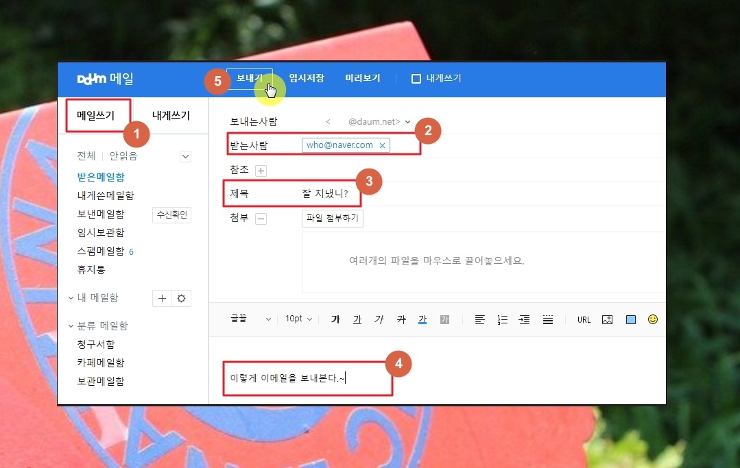 새롭게 이동한 웹페이지에서는 이메일을 받거나 보내는 기능을 갖춘 프로그램 화면이 나타납니다. 여기에서 좌측 상단에 있는 [메일 쓰기]를 클릭해 주세요. 그 다음 바로 오른편에 받는 사람의 mail 주소, 제목, 내용을 입력합니다. 보내고 싶은 파일이 있다면 첨부 영역에 여러 개의 파일을 마우스로 끌어서 놓으면 됩니다. 여기까지 완료했다면 마지막에 화면 상단에 있는 [보내기]를 클릭해 주세요.