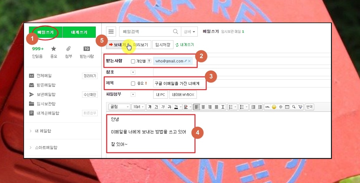 여기서도 인터넷 mail을 보내는 프로그램이 나타나는데요. 좌측 상단에 있는 [이메일 쓰기] 버튼을 클릭한 후, 오른편에 있는 빈 칸을 채워 넣기만 하면 됩니다. 받은 사람의 mail 주소를 입력할 때에는 "who@gmail.com"와 같은 형식으로 입력해야 합니다. 한 번에 여러 명에게 같은 내용의 이메일을 보내는 것도 가능합니다. 직접 상대방 주소를 계속 추가해 보세요. 내용까지 다 입력했다면 5번 위치에 있는 [보내기] 버튼을 누르면 됩니다.