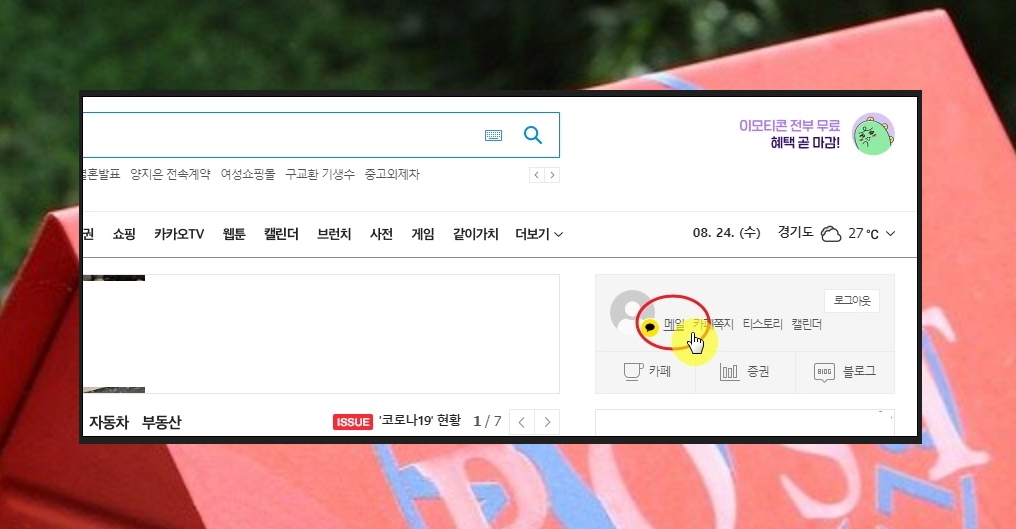 그럼 각 플랫폼을 이용한 이메일 보내는 방법을 알려드리겠습니다. 가장 먼저 다음을 이용한 방법입니다. 다음 사이트에 접속한 후 로그인을 합니다. (로그인이 되어 있지 않다면 가입해 주세요.) 로그인을 하면 사이트 화면 오른쪽에 [메일]이라는 버튼이 보일 겁니다. 클릭해 주세요.