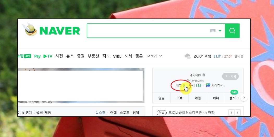 이번에는 네이버 계정을 갖고 있는 경우에 이메일을 어떻게 보내면 되는지 방법을 알려드리겠습니다. 네이버 사이트에서도 로그인을 합니다. 그 다음 [메일] 버튼을 클릭하는 것은 동일해요.