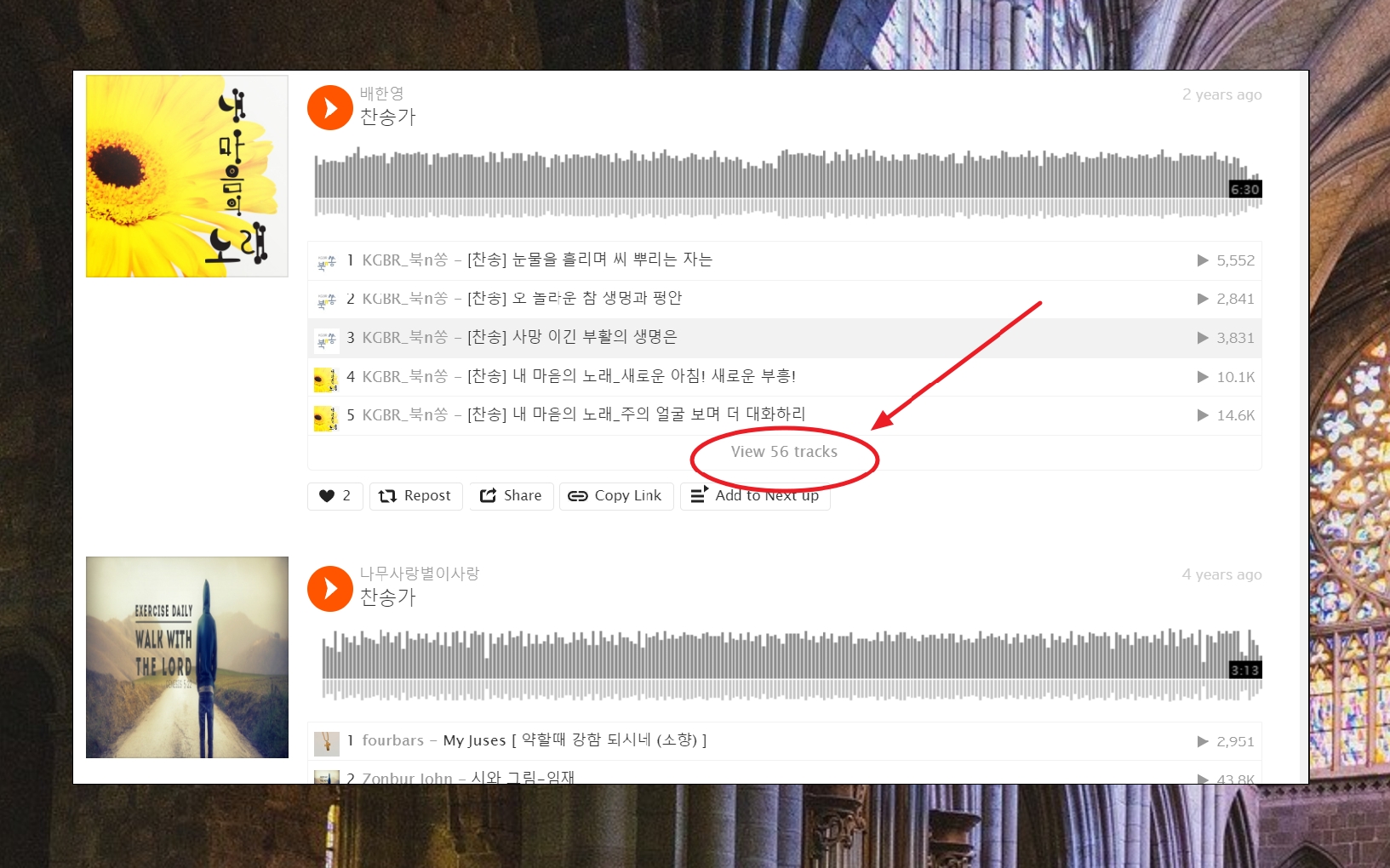좌측에 있는 메뉴에서 "Playlists"를 선택하면 찬송가 모음집을 찾을 수 있습니다.