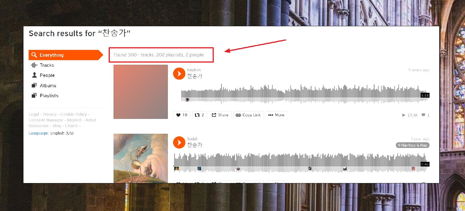 검색 결과에서 볼 수 있듯이 500개 이상의 곡과 202개의 플레이리스트를 찾을 수 있었습니다.