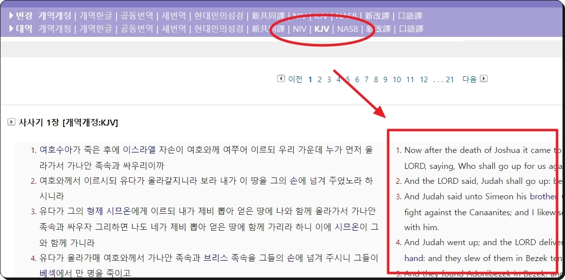 영어로 성경을 읽으려고 할 때 해석이 잘 안되어서 막히는 부분이 있을 수 있어요. 이런 경우에는 사이트 상단에 있는 [변경]이나 [대역]에 있는 NIV, KJV, NASB 중에 하나를 선택하면 됩니다. 중국어 선택도 가능하오니 참고해 주세요.