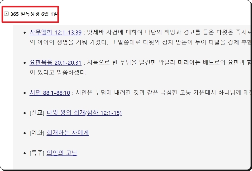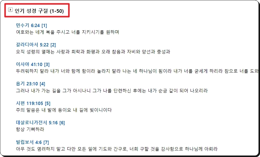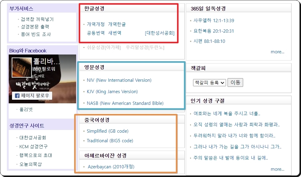 마지막으로 처음부터 끝까지 성경읽기를 진행하는 것이 벅찬 분들을 위한 서비스를 알려드릴게요. 해당 사이트에서 제공하는 365일 일독성경 서비스와 인기 구절 서비스인데요. 성경읽기에 재미를 붙이고 싶을 때 활용하면 정말 좋아요.