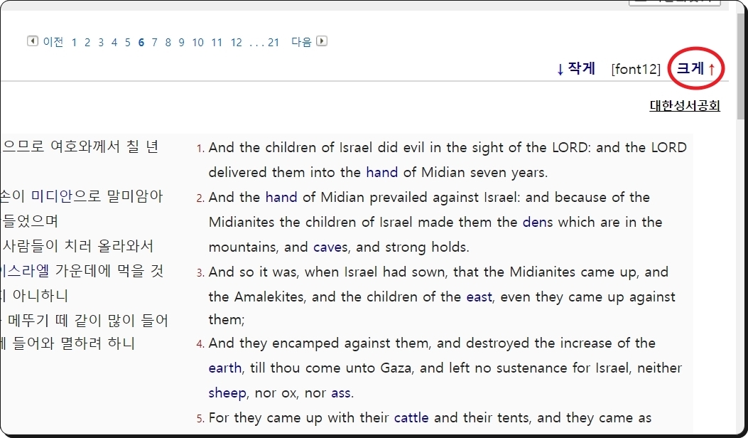 저는 "사사기 1장"을 선택했는데요. 화면에 내용이 나타나기 때문에 바로 읽기 가능합니다. 내용을 읽다보면 파란색으로 된 단어가 보일 텐데요. 클릭해 보세요. 그럼 새롭게 창이 하나 나타나면서 KCM사전을 이용할 수 있습니다. 뜻과 관련된 내용을 알려주기 때문에 혼자서 읽거나 이해하는 데에 도움이 돼요.