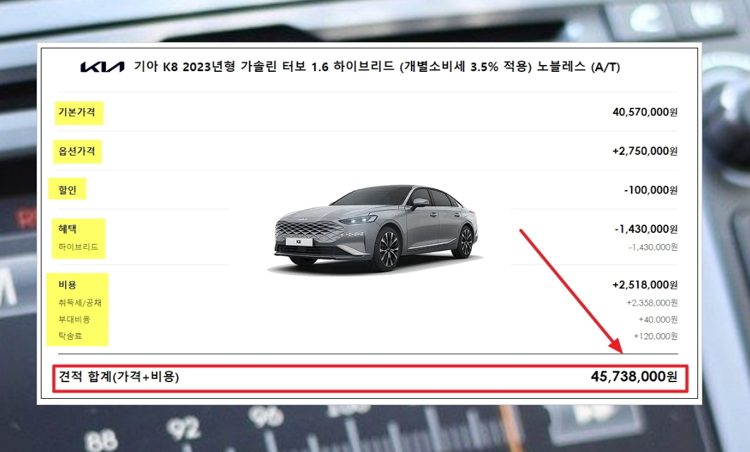 다음은 제가 방금 뽑은 최종 가격표 입니다. 제가 선호하는 옵션, 트림(세부등급), 할인 조건 등을 반영한 것인데요. 기아 K8 2023년형 가솔린 터보 1.6 하이브리드 모델을 구매하려고 할 때 얼마의 예산을 준비하면 되는지 정확하게 알 수 있습니다. 저는 자주 이용해 보았기 때문에 1분도 안 걸렸어요. 자신이 원하는 조건을 선택하기만 하면 바로 받아볼 수 있습니다.