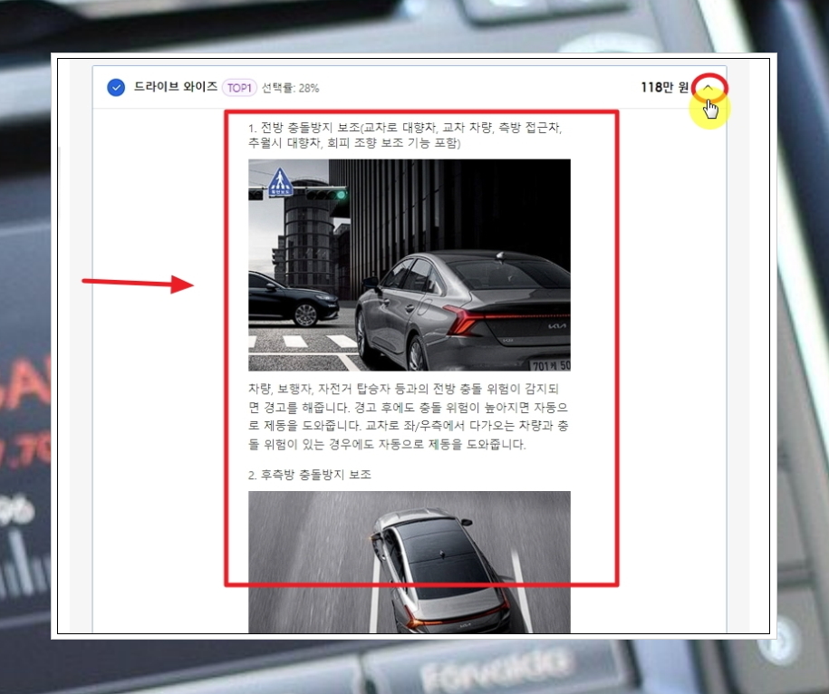 기아차에서 정해 놓은 옵션의 이름만 보고는 어떤 기능을 하는지 어려울 수 있습니다. 이런 경우에는 표시된 금액 옆에 있는 화살표를 눌러보세요. 그럼 해당 옵션이 어떤 기능을 제공하는 것인지 사진과 글로 설명해 줍니다.