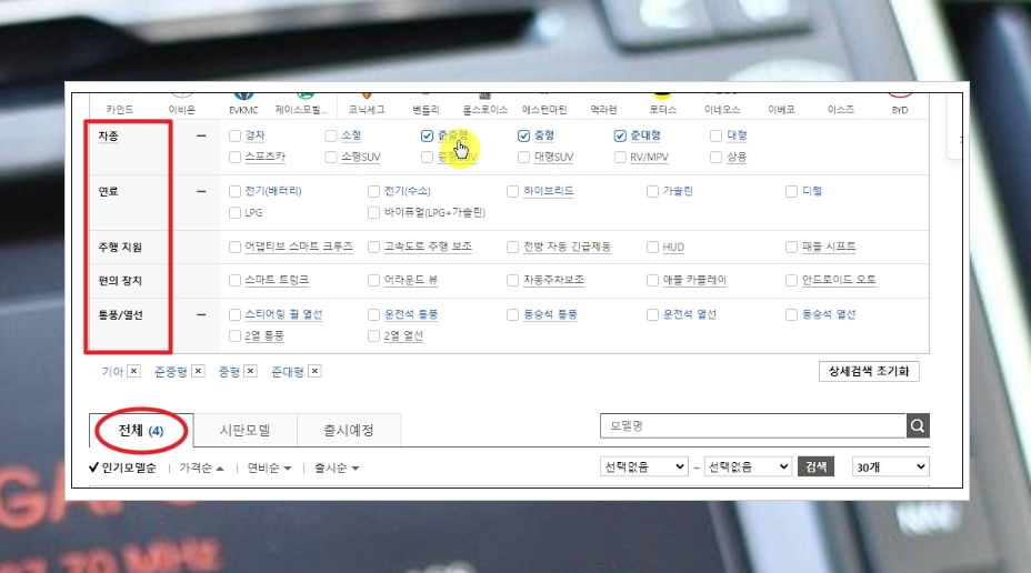 기아자동차에서 제조하는 자동차 모델 중에서 자신이 원하는 것을 선택해야 하는데요. 차종, 연료 타입, 옵션 등을 지정하면 해당 조건을 충족하는 모델을 찾아줍니다. 저는 준중형, 중형, 준대형에 해당하는 모델만 골라보았는데요. 여기에 해당하는 모델이 4가지가 검색이 되었네요.