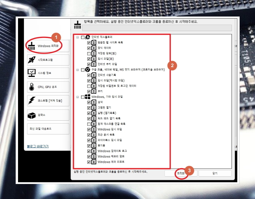 가장 먼저 Windows 최적화 버튼을 눌러보겠습니다. 한 방에 여러 가지 임시 파일을 정리해주는데요. 이러한 임시 파일은 PC 속도를 느리게 만드는 요인 중 하나입니다. 하드디스크 용량 부족을 발생 시키기도 하기 때문에 원하는 프로그램의 실행을 방해하기도 합니다.