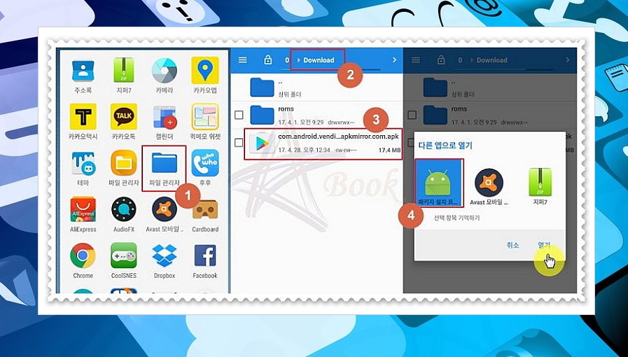 소유하고 있는 스마트폰의 메뉴를 열어보면 '파일 관리자'를 찾으실 수 있습니다. 기본 프로그램이기 때문에 따로 준비하지 않아도 이용할 수 있는데요. 좀 전에 받은 구글 스토어 파일을 찾은 후 클릭을 하시면 됩니다. 그럼 '패키지 설치 프로그램으로 열기' 버튼이 나타나는데요. 이 상태에서 열기를 누르면 자동으로 설치가 됩니다.