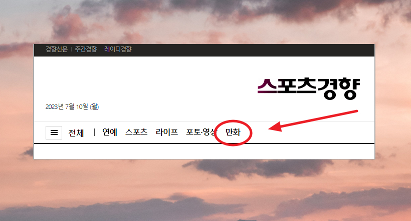1. 그럼 만화를 보기 위해 스포츠경향 사이트에 접속해 보겠습니다. 아직까지 많은 분들이 잘 모르시는 경우가 있는데요. 요즘에는 여러 신문 사이트에서 만화를 볼 수 있는 서비스를 많이 제공하고 있어요. 그중에 스포츠경향이 개인적으로 제일 낫다고 생각합니다.