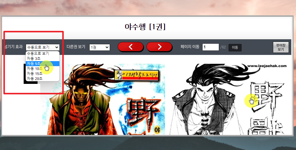 7. 작품을 마우스로 클릭하면 바로 만화를 감상할 수 있습니다. 오른쪽 화면을 클릭하면 다음 페이지로 넘겨 수 있는데요. 일일이 남기기 귀찮은 분들은 좌측 상단에 있는 넘기기 효과를 이용해 보세요. 일정 초마다 자동으로 넘길 수 있습니다.